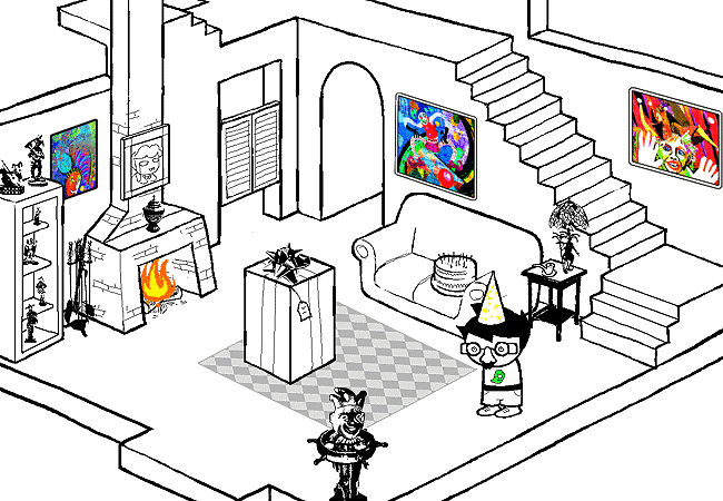 Continuing from where we left off, John leaves his bedroom to go to the first floor of his house, to sneak around and obtain his discs of Sburb. We see a living room filled with clown pictures which suggest that his father is obsessed with clowns, a birthday present, and his grandmother’s ashes. It’s also mentioned for the first time that John hates Betty Crocker, marking the first indirect mention of one of the comic’s main villains, although the whole evil Betty Crocker thing would for a long time thereafter remain merely a joke. Besides the numerous clowns, there isn’t much remarkable in John’s living room, especially compared to what we see with the other kids.