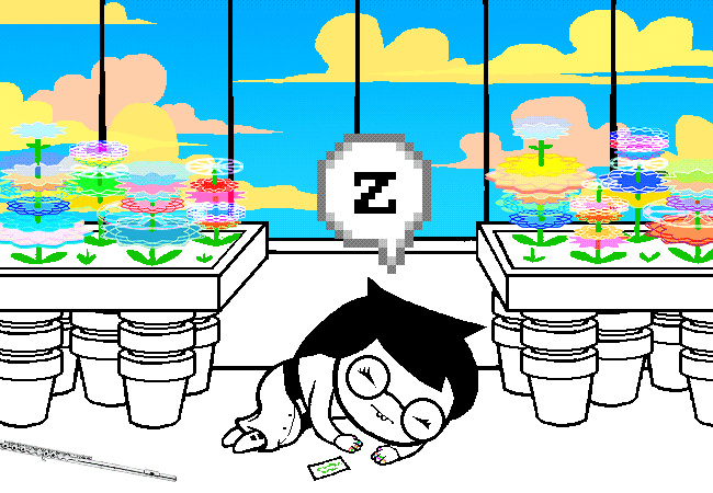 Jade subverts almost every pattern we had when we met John, Rose, and Dave, and I’ll count every time that happens. Besides (1) the joke name gag, we see that (2) her shirt symbol is not static and constantly changes, and that (3) she is introduced in her atrium instead of her bedroom, (4) without listing all her interests right away. Some of the patterns are averted with red herrings, the most notable of which is how we’re led to believe that her guardian is her grandfather rather than her dog, an extreme odd one out. The next pattern subverted is by red herring: (5) her musical instrument appears to be the flute, but she doesn’t actually know how to play it—or where the flute came from (never explained later)—and her real instrument is the electric bass, seen later. One thing of note in the flute minigame where you can make a different note with each key is that “Z” makes Jade go to sleep. It’s later revealed that Vriska’s experimenting is why Jade falls asleep so much, so when you press Z, in a sense you’re playing as Vriska rather than Jade. Interestingly, Jade seems to retain the habit of sleeping a lot even after the timespan in which the trolls can view the kids; in Act 6 Act 6 Intermission 4, John says, “you know, [jade] does like to sleep a lot.”