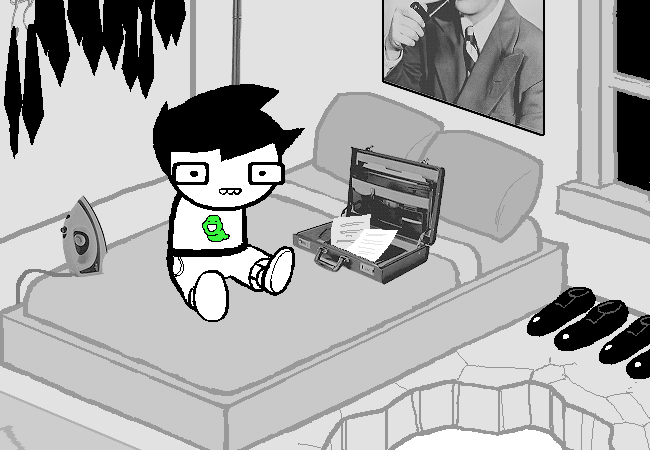 PM survives the explosion and the sentry worm in the command station retrieves her mail. Rose fails to refuse to acknowledge the mutant kitten, because you can’t say no to cats. She views her young self having a psychoanalysis session with her cat. As Dave puts it: “[psychoanalysis has] been like her EXACT top preoccupation since she was a fuckin baby.” The cat told Rose a secret, then vanished to show up dead two weeks later. Rose fast forwards through Jaspers’ timeline in a gloomy animation, showing that her mother held a dramatic funeral for the cat and that it ended up in a whole different room. It’s hinted that her mother tried and failed to make a new clone of the cat. Rose appearifies the cat again and gets the hell out of here. Jade’s dog Becquerel is glimpsed, and it’s stated that he somehow manages to elude her base of knowledge. What’s the deal with that dog? Before we find out, we have to see what’s in John’s dad’s room. Are you ready for a room full of …