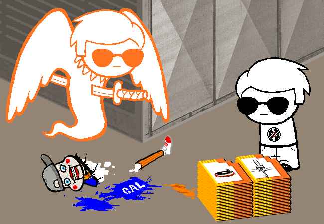 Then we get another cool flash in which we’re introduced to Dave’s planet, the Land of Heat and Clockwork. We see that Dave alchemized lots of stuff while we weren’t looking (suit, sword, timetables), and fights underlings in a badass sequence with the help of his sprite, regrettably prototyped with Lil’ Cal, whose puppet attacks are both hilarious and nightmarish. Typically, readers will think, why the hell did we skip so much stuff?! Not just Dave entering the medium, but Cal getting prototyped, Dave’s alchemy binge, and his progression through the gates (all the way through number 5 according to the loading screen!). Also, I really like the choice of music in the flash, with the constantly repeating bass pattern, the 6/8 beat, and lava effects really fitting for a planet filled with gears and lava.