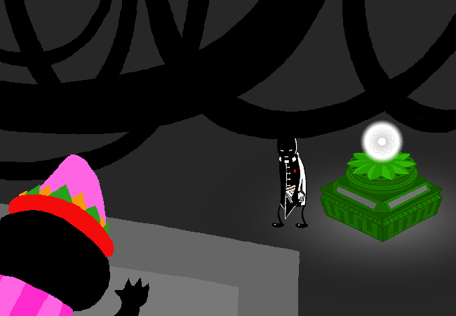 John is trolled some more by Karkat, who warns him that he’s going to do something ridiculous, and that the Reckoning will start soon. He explains that Jack Noir is why the kids fuck everything up so badly, and how in his session Jack was an ally who helped the trolls exile the black queen. John doesn’t quite understand, and Karkat decides to explain it to him in terms of Earth video games: