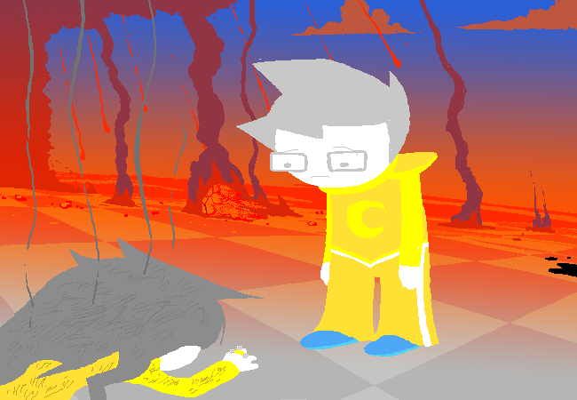 - John explores his planet, talks to Karkat and Terezi a lot, almost gets killed by Terezi’s instruction, goes to Rose’s land and then to the Veil, creates our heroes, and has his dream self wake up right when Prospit is destroyed. His character gets some development through his interactions with Dave and Davesprite, and with the trolls. At first he hates the trolls but he gradually warms up to them, realizing that they’re often kind of stupid, outwitting Karkat more and more through his reverse train of conversations with him, and even snarking at some of them (especially Terezi). He also has something of a life trial when he almost blasts off to his seventh gate despite future Dave’s warning.