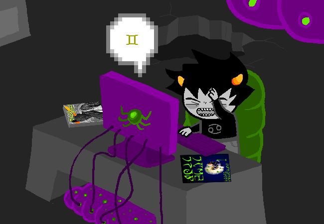 Before we begin, I’d like to say stuff about Homestuck’s trolls. Although their existence was not planned from the start, they’re a very integral part of what makes Homestuck what it is. For many people, when they hear “Homestuck”, the trolls come to mind. It’s hard to hear about Homestuck without knowing that the trolls are going to show up at some point, and I’m no exception. Like I said in posts as early as Act 3, I saw a handful of pictures and videos of Homestuck stuff before reading it, so I knew about the trolls beforehand. Because of the trolls, for quite a long time I had the impression that Homestuck was pretty much just plain weird. The trolls are weird, sure, but they’re a very colorful and appealing cast of characters. They range from a lovable paranoid grouch to a stoned juggalo who eventually turns evil to a pretentious wanna-be wizard and more. What adds to the appeal of the trolls is that each person has a corresponding troll based on their date of birth because of the zodiac stuff. If you’re wondering, my zodiac sign troll is Aradia.