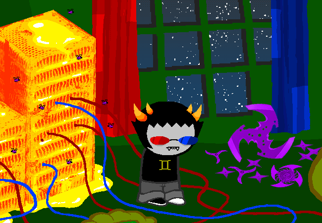 We skip in time to Sollux waking up from his nap, when meteors are storming around his hive and he just had dreams where he envisioned lots of important things. He wakes up, accidentally eats some mind honey, and blasts out mega-powered eye beams. Before I read Homestuck, I saw a line from this scene “YOU DO NOT UNDER ANY CIRCUMSTANCE EAT THE MIND HONEY” quoted in the signature of a user in some online forum and attributed to Sollux, and I still find this line hilariously bizarre out of context, though that could be said regarding just about any line in Homestuck.