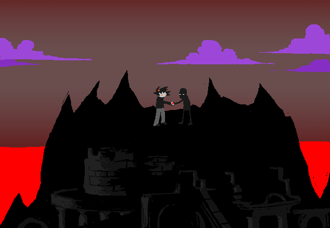 Karkat goes on to tell Vriska that he met his session’s Jack Noir, who greeted him by stabbing him and has some information about the black queen, who he’ll need Vriska’s mind powers to help overthrow. Then we go back a few minutes to when Jack Noir stabbed Karkat, and it’s revealed that his blood is bright red. Karkat panics, so Jack stabs his hand and shows that he also has red blood, which he thinks is normal. This scene is interesting because it shows us the compassionate side of one of Homestuck’s main villains, and just how different from each other separate versions of him can turn out to be. Karkat and Jack shake hands, leading to another expository interlude.