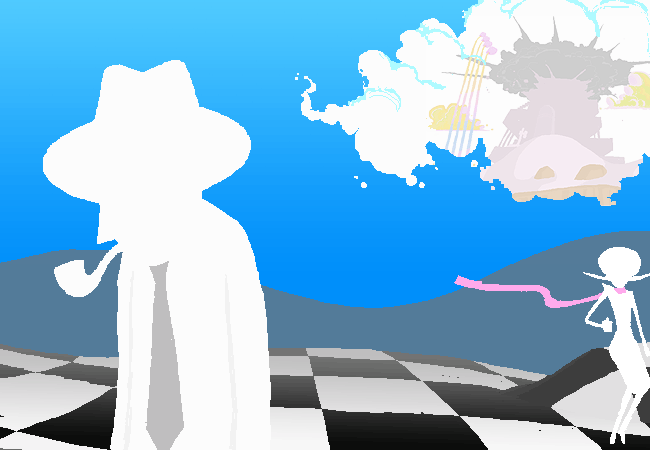The opening flash of Act 5 Act 2 is absolutely brilliant. We just got done learning all about how incredibly messed up troll civilization is, and now we go back to the kids’ universe, recapping John’s life, and it seems so magical and beautiful. The scenes with John and his father are so adorably heartwarming, especially baby John riding his pogo and bruising his leg, and his dad walking over to him. He learns to cook and play piano, is taught the ways of pranking, talks to Jade for the first time, gets a green slime shirt, and then starts playing Sburb and goes through some stuff we already saw, until we see where we last saw waking John, riding a rocket board through the Veil. Karkat falls in hate with him, thinking he’s his true destined kismesis (note the spade shirt), which I didn’t realize until now is special for him because he said a little while ago that his standards are too high to have a worthy black partner, barring himself.
