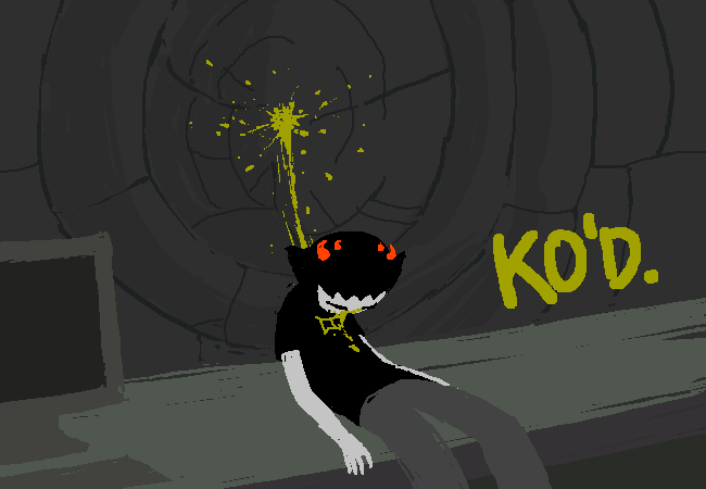 Note the impact crater in the wall. God damn do trolls have sturdy bodies. It probably should’ve left a bigger splash of blood, probably a smaller impact crater, and killed him, but I guess trolls are different. Tavros merely lost the use of his legs when Vriska jumped him off a cliff.