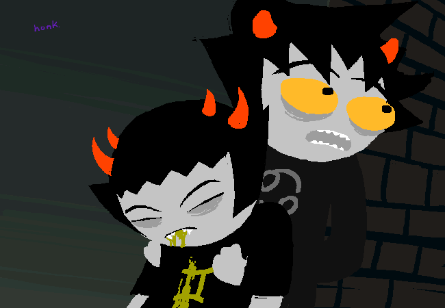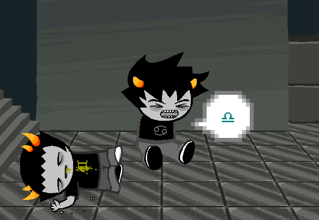 God, what a living nightmare this whole thing is for Karkat. It takes only a single lowercase “honk” to scare the living shit out of him. Not only does he have to witness his friends all dying, now he casually hears of more murders shortly followed by what he can only assume is even more murder (Gamzee responding in Terezi’s place). He had kept his whole entire team in check for a good few weeks but now they’re suddenly killing each other—what’s up with that? Why is everyone going psycho now of all times? It’s not like there wasn’t a hell of a lot of stuff going on in the trolls’ session. Let’s do a forensic (not really forensic) analysis of the murder stuff itself!
