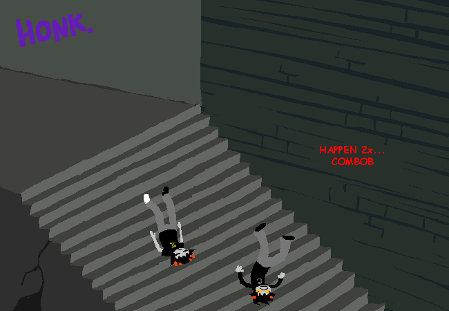 Karkat finds that Sollux’s teeth fell out when they fell down the stairs and puts them back in, which is yet more slapstick amidst murder. As I said in the picture caption, it kind of reminds me of Weekend at Bernie’s which turns death into a laughing matter; though Sollux is actually just unconscious it’s the same idea. And yes, I have actually seen that movie (or most of it at least) during a livestream about a week ago of movies referenced in Homestuck.*