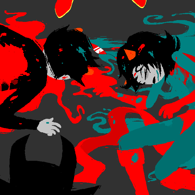 Scratch goes on to point out that Karkat and Terezi dying is a callback to that dream bubble sequence where we learned about his origin. And it has a very subtle but definitely existent visual callback: compare this image to this one and you’ll see that both have the exact same arrangement of blood and hair around Terezi’s glasses.