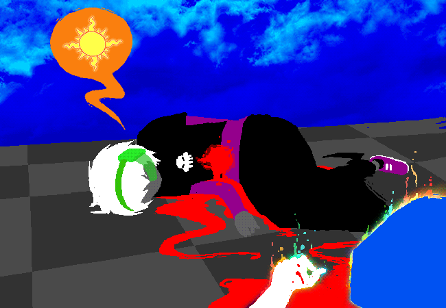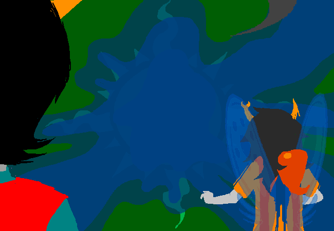 Kanaya and Sollux are next to join the scene, the former undead and the latter blinded. I think this nicely serves to show how decimated the group of trolls has become. In addition, it’s somewhat heartwarming seeing that they joined the scene together, and less obviously, that Sollux took Feferi’s goggles; presumably to see better, though I don’t think that’s ever explained. I wonder if the goggles were just there as a bit readers may or may not catch; it seems a bit odd to loot possessions from a loved one’s corpse.