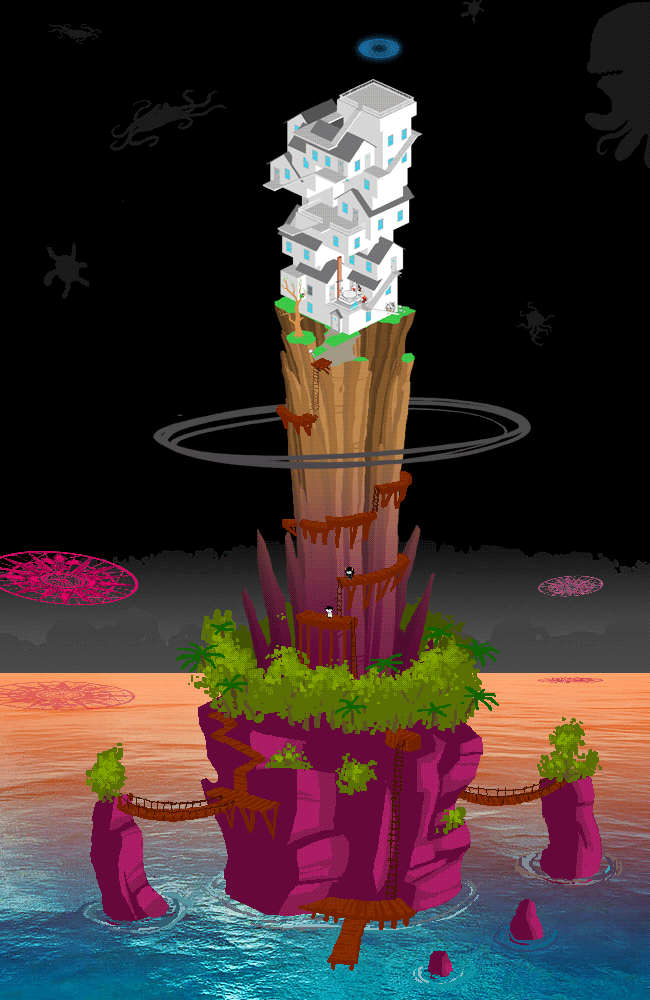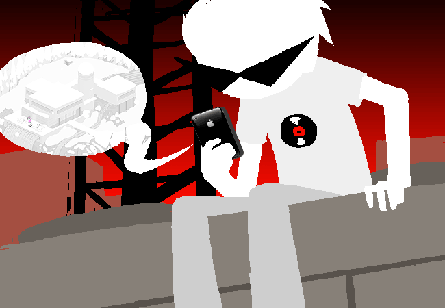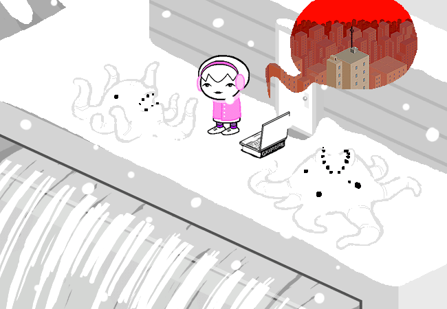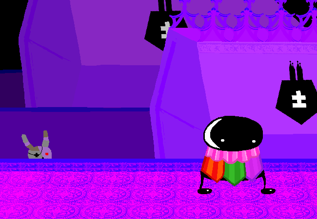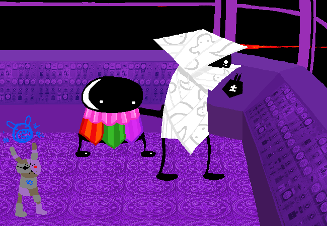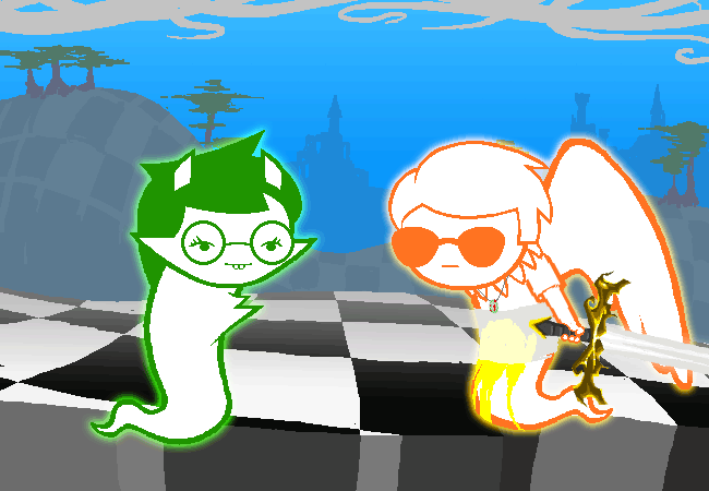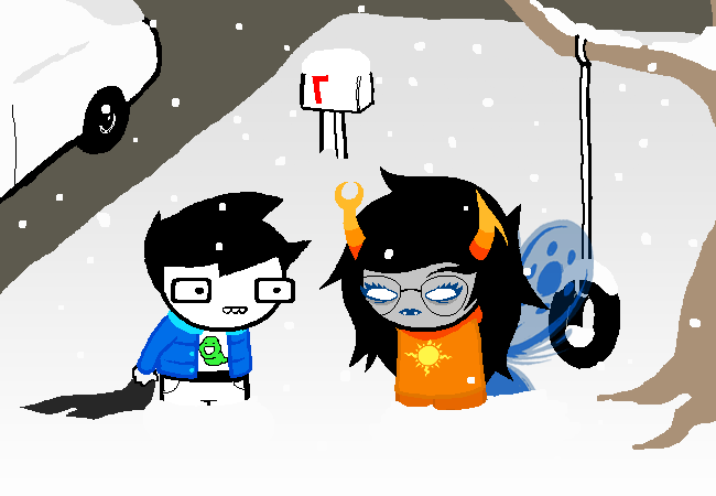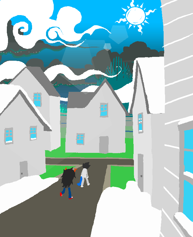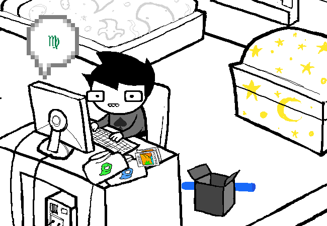 Also, the art in the picture is a bit of an optical illusion that plays with weirdnesses that can arise from isometric projection, somehow connecting Vriska’s floor to John’s wall when that shouldn’t be possible.