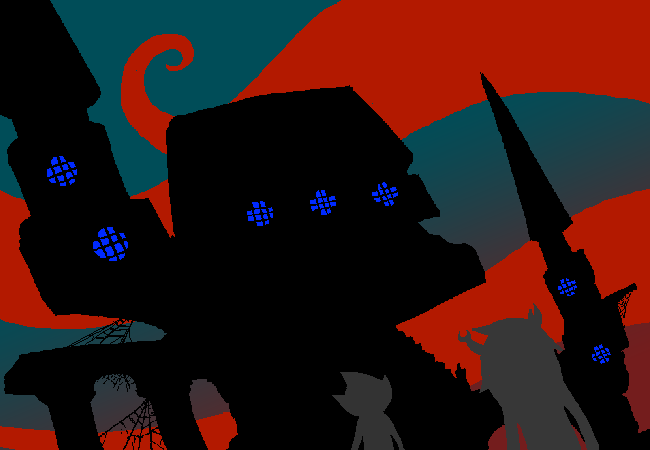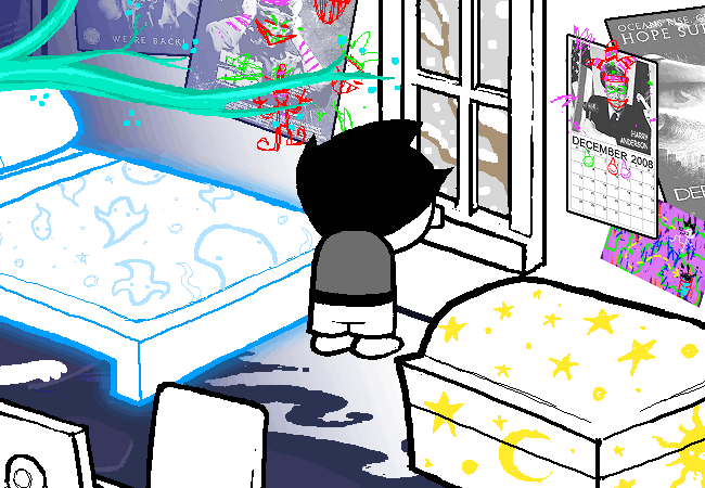 I like how this image above is yet another image where one half is John, the other half is Vriska. Also it has the one side dark, one side light color scheme again. Vriska’s half of the image has some interesting things about it. On her walls, there are some Nic Cage posters, which I can only imagine is what her room would be like had she still used that room after trolling the kids. There’s also some rather inexplicable things there: Tavros’s severed legs (gross) and a red package which, despite probably being John’s present from Dave, I have no idea why it’s in Vriska’s half of the picture.