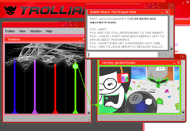 Near the rift in the kids’ session, Jade apparently can view the exiles on her monitor. I have no idea why that is, aside from transitioning to the exiles. Also, the memo board, as shown above, is called The Dropper Nest.