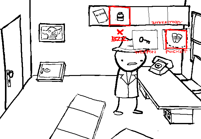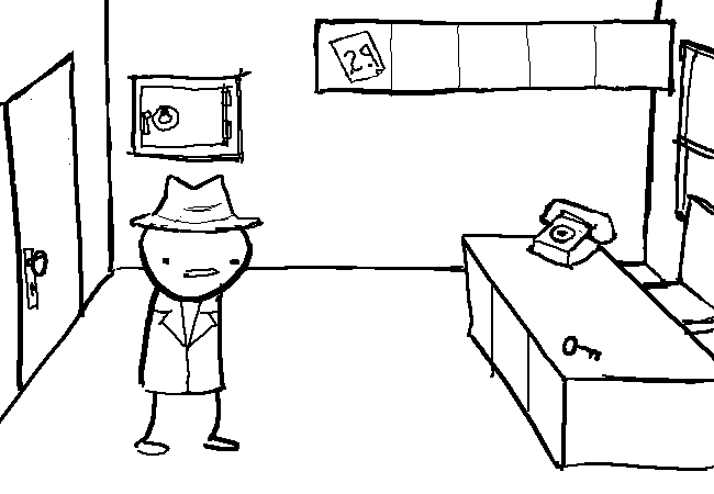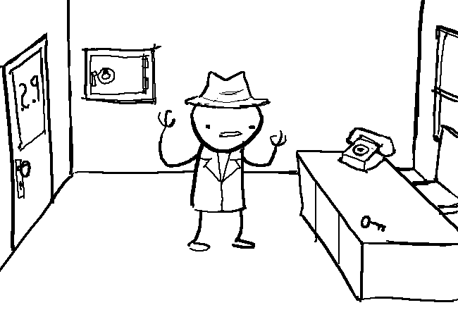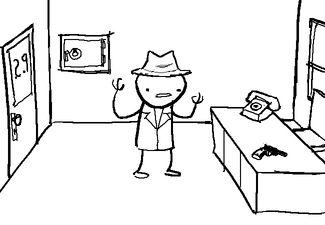 Now here’s where the story does something exceptionally trollish. Problem Sleuth is commanded to examine what’s taped to the bottom of the phone, but while he does so his finger slips, using up the last bullet and blowing up the lock, thereby leaving him stuck in his office unable to unlock the door. This is a really stupid yet simultaneously brilliant way to trap our hero aside; it accounts for little things going on in the background that aren’t normally acknowledged in video games.