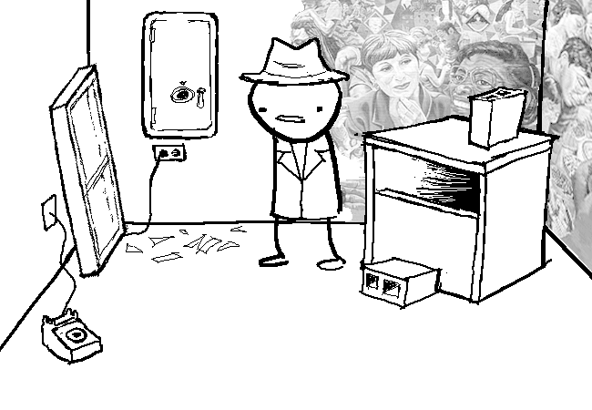 Looks like the clown picture’s eyes are how Problem Sleuth can see into Ace Dick’s office. I guess that answers that.