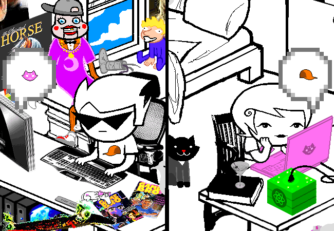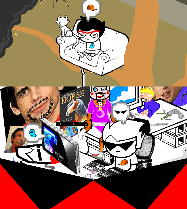 I really think Dirk is right that despite what she says, Calliope’s work probably isn’t all that bad; she seems to be meant as a parody of fangirls who like writing the innocent kind of shippy fanfiction, not the weird smutty erotic kind about characters having sex. Besides, how would she know—you know what I’ll stop talking about that.