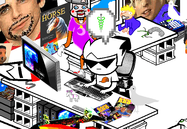 We now switch focus to Dirk’s dream self, and the big thing I notice here is that all but a few items are tinted red: the ones that aren’t are the rocket board, Minihoof, the Dersite newspaper, Cal, and Dirk himself. My guess as to why that is is because the colored objects are items specific to the dream world, not just projections of his own possessions. The deal with the apparently “real” version of Cal in his dream self’s room is never explained, which is a bit of a plot hole: we don’t know if it’s empty or full, let alone what happens with it, and I can only assume it isn’t a projection because of its coloring.