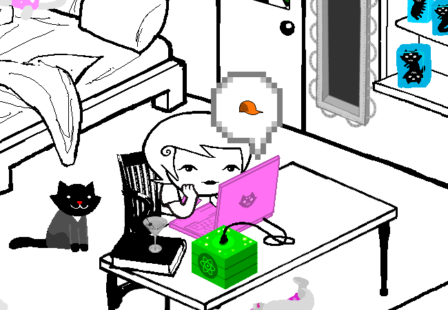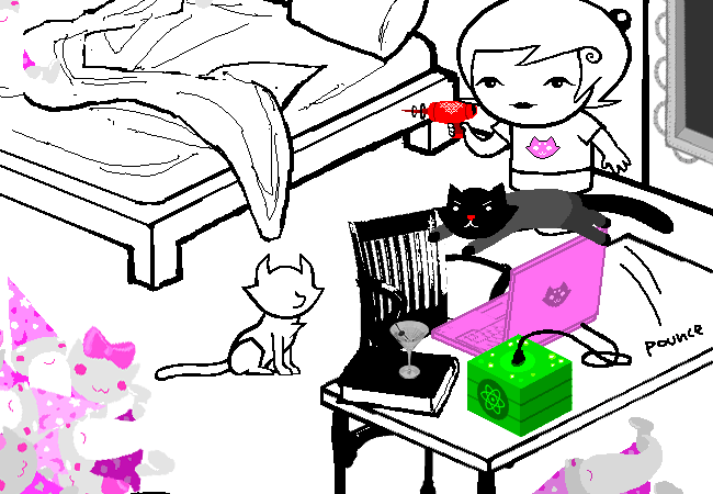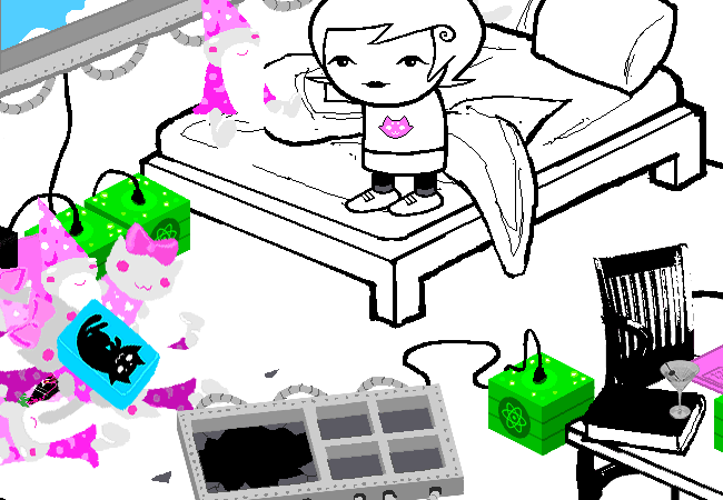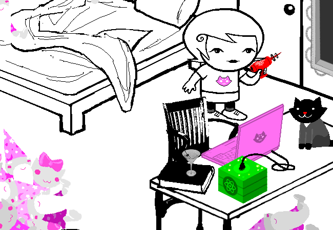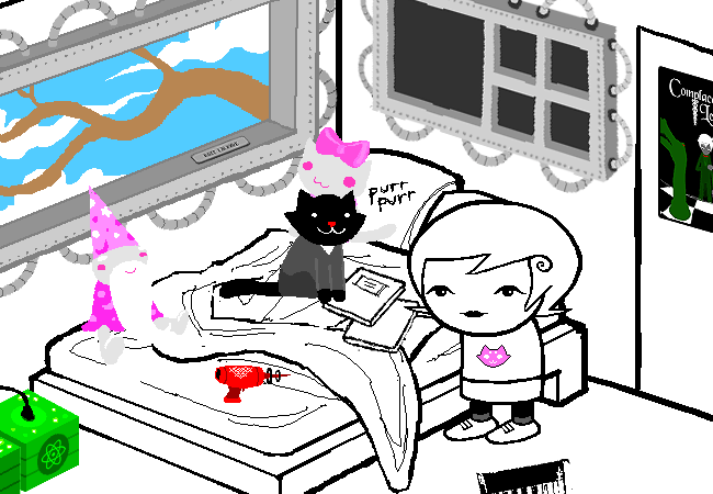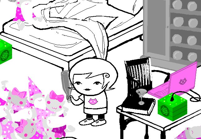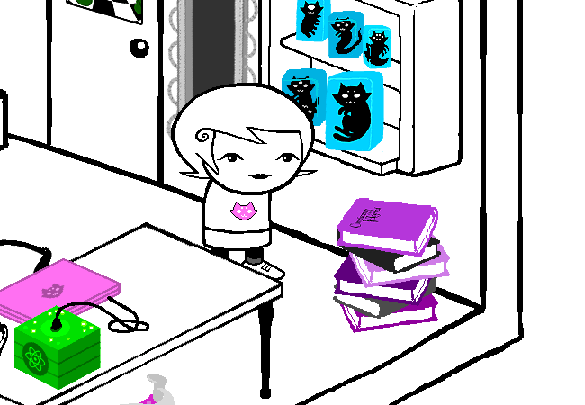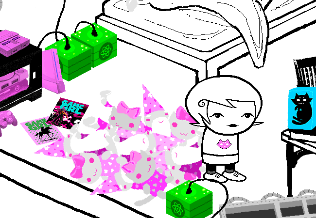 Once again, only certain items in Roxy’s room are “real”: the GameGrl magazines, the wizard plushes, and Frigglish. It’s not totally clear to me why those are real, though I can take a guess. Her plushes are probably real because they’re what she fell asleep, Frigglish because he’s a living being, and I have no idea why the magazines are colored like that. I will say that I’m starting to think that living things in the comic simply have dream selves whenever they’re inside a player’s room. I think dream selves are supposed to work like that, as projections of sorts? I don’t know.