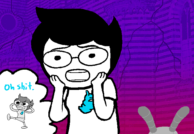 Here’s another thing I forgot about. It’s later revealed in one way or another that Dirk helped Caliborn build a robot leg years prior. Some foreshadowing if I’ve ever seen any. I can’t even begin to imagine what readers thought the thing Dirk built was. But what I can begin to imagine is the symbolism that Caliborn and Dirk have a legitimate dynamic of sorts, to the point where they even work together in weird twisted ways. I don’t recall Dirk learning how much Caliborn starts messing things up, other than partaking in the fight against his group’s Jack. But it is clear that he, akin to the Derse dreaming beta kids (especially Rose), actually has decent interactions with the alpha kids’ equivalent of the trolls.