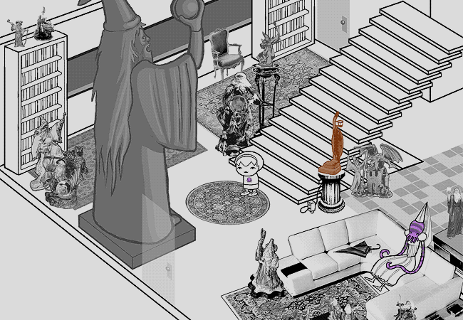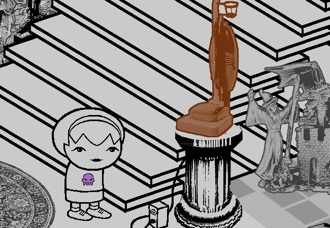 Comparing it to John’s ordinary living room filled with a collection of clowns, it’s no surprise that Rose’s living room houses a giant swath of wizards in a setting a bit more eccentric than before. The two things that are likely to stick out to readers—the bronze vacuum cleaner and the squid princess doll—are explained shortly, so I’ll go over them as I go along.