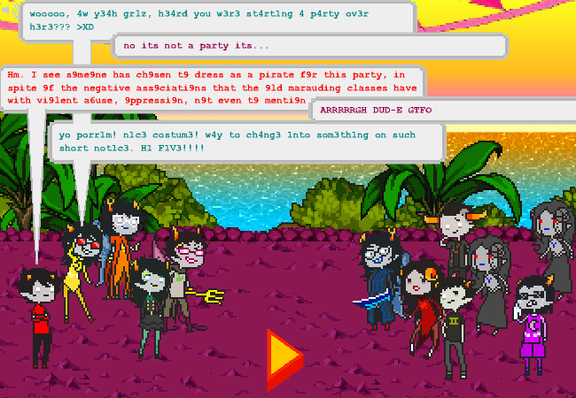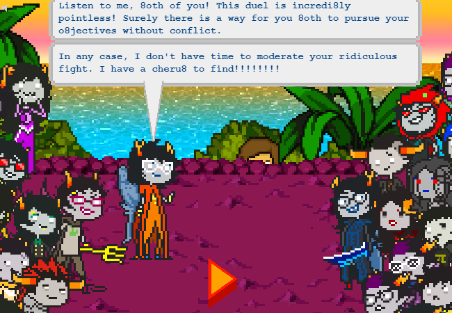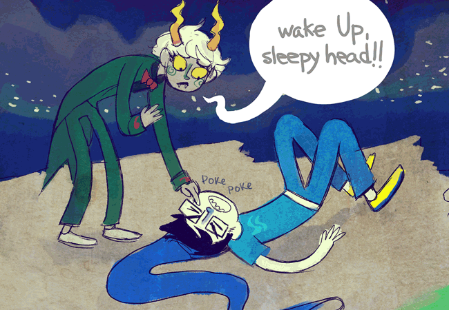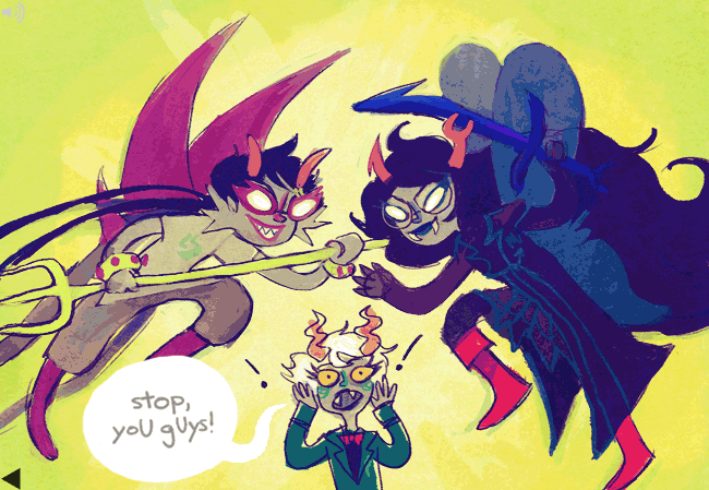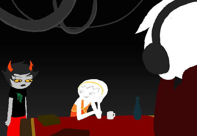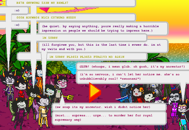 There is a whole world of fucking around going on with the meteor crew during the second year of their voyage, and it would be a criminal act of negligence to end this intermission without at least having a peek at their tomfoolery. A weaker person would just want to see what happens with Meenah and Vriska right away. Thank goodness you are a player with a strong sense of responsibility and discipline.