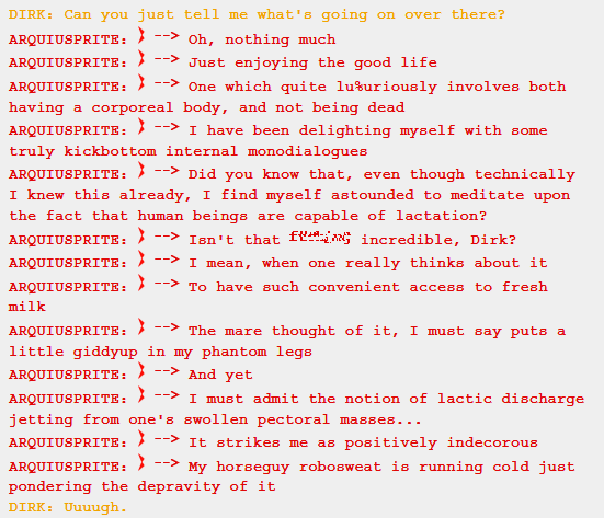 Here, Arquiusprite does what he does best: providing bizarre trivia on things absolutely no one asked about. This is what he does for most of this conversation, which is hilarious for the reader but painfully useless for Dirk.