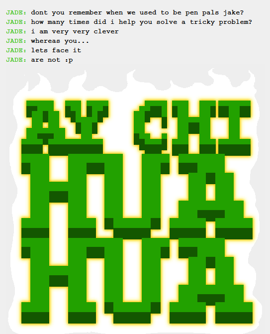 While Jade tells Jake to stop powering up and Aranea expresses her approval of Jake’s insane hope field, I can’t help but notice that Jake’s enormous old man interjections are still written in his typing quirk, as indicated by the lack of an apostrophe on “BOBS YOUR UNCLE”.