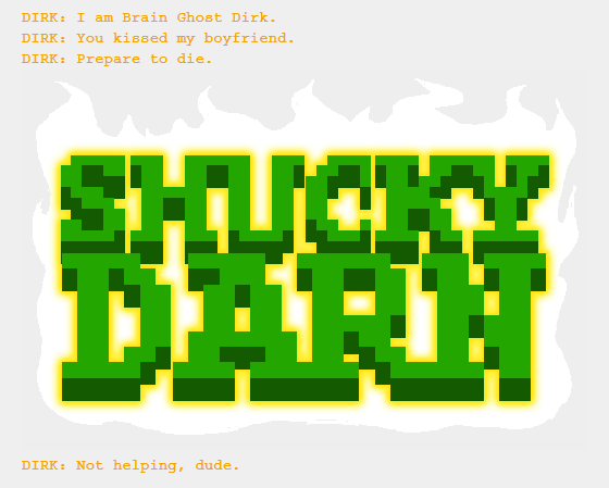 This reference to whichever movie (I don’t even know if it’s a movie) “you killed my father, prepare to die” came from raises some ambiguous implications about how Jake sees his relationship with Dirk. Does he genuinely love Dirk in a romantic way, or does he think Dirk genuinely feels about him that way which is why Brain Ghost Dirk says “you kissed my boyfriend”? Or maybe it’s just that his maxed-out hope powers make him believe in Dirk far more than he ever has. Booming loud corny old man interjections are all he’s capable of saying in his Super Saiyan form, so it’s dubious how much of Jake’s personality this form preserves—he normally uses a fair share of regular profanity alongside his old man speak.