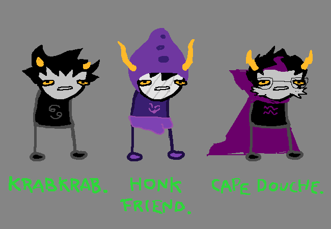 Caliborn’s nickname for Gamzee (HONK FRIEND.) is some sneaky character development. When he first met Gamzee, he fired his gun at the clown for five minutes straight, because that was his natural instinct when encountering another living being. But now, quite some time after Hussie’s self-insert eased him into the practice of teamwork to initiate the rad as fuck split screen section of Act 6 Act 5, he finally sees Gamzee as a friend. Why else would he nickname the guy “honk friend”?