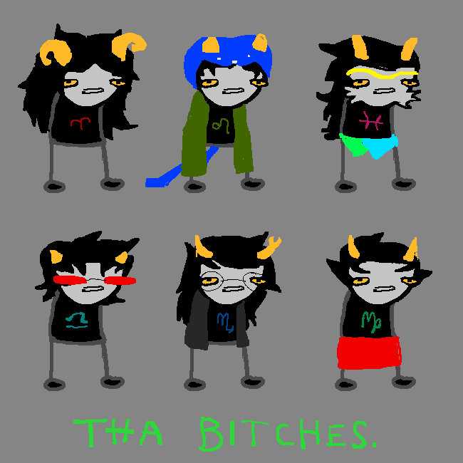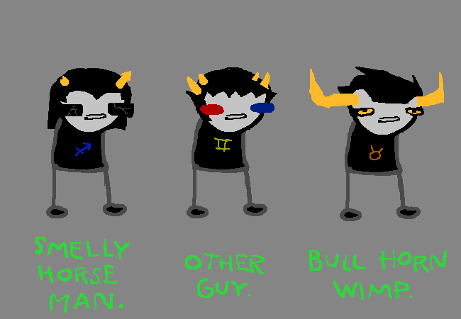 As for Tavros’s nickname (BULL HORN WIMP.), I think you get the idea. Succinct descriptions that show that the male Alternian trolls are all quite distinct from each other in Caliborn’s mind. The female trolls, on the other hand…