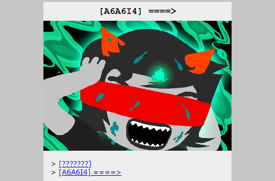 Terezi tries to do a mindy thing; the [???????] link added a few updates later cleverly foreshadows that her plan to use this moment as a starting point for the retcon journey worked as intended. I’ll say more about the password system when we get to use it in action a few posts later. For now, I’ll say that Vriska debates or not, the question mark command splits are a very clever way to convey John and Terezi’s retroactive intrusion into the narrative of Homestuck. Certainly more clever than all the many times characters in Homestuck^2 and Pesterquest merely talk about the concept of canon.