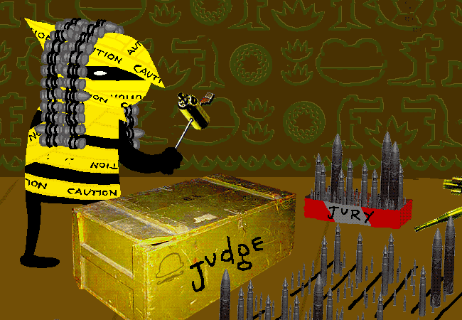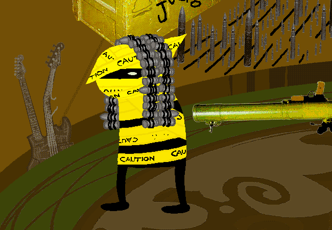 After spying on the other two exiles supposedly breaking the law, AR makes his equivalent to Can Town using the various supplies in the frog temple: a makeshift courtroom made entirely out of guns and bullets. Weird that he doesn’t end up wearing his bullet wig as a regular accessory like WV with his mayor sash; maybe he felt that thing looked exceedingly goofy.