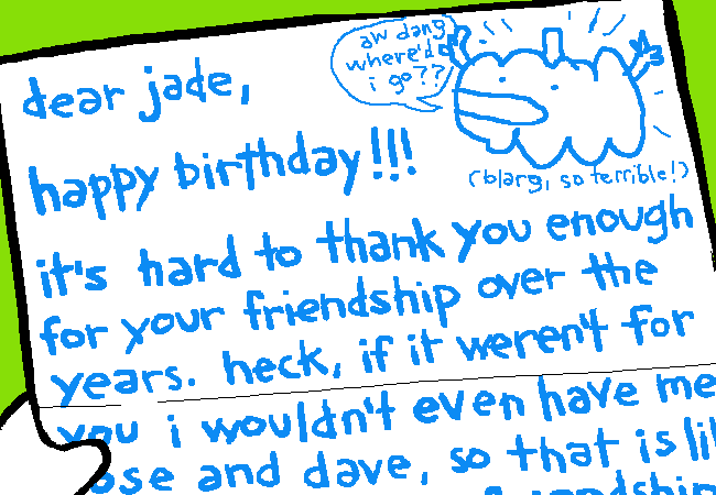 Unlike with Rose and Dave, John finds it difficult to express how much Jade’s friendship and influence means to him, so he figured it was best to give her a few silly things. John can’t seem to come up with a good message to give Jade about what kind of friend she is, which perhaps indicates that at this point she’s still a plot device above all else.