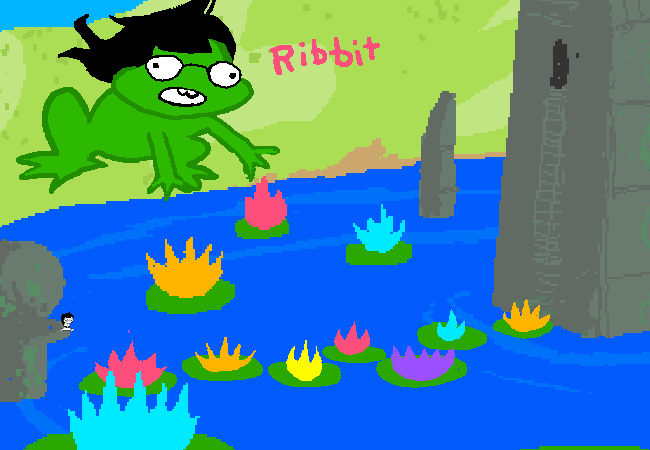 In what I’m guessing was a reader-submitted command, Jade plays her bass to summon lily pads and make it to the frog temple. It seems like this is the suggestion Hussie liked the most, which makes sense because it’s a good use of an ability we previously saw in her advanced bass solo flash, not a new ability randomly introduced out of nowhere.