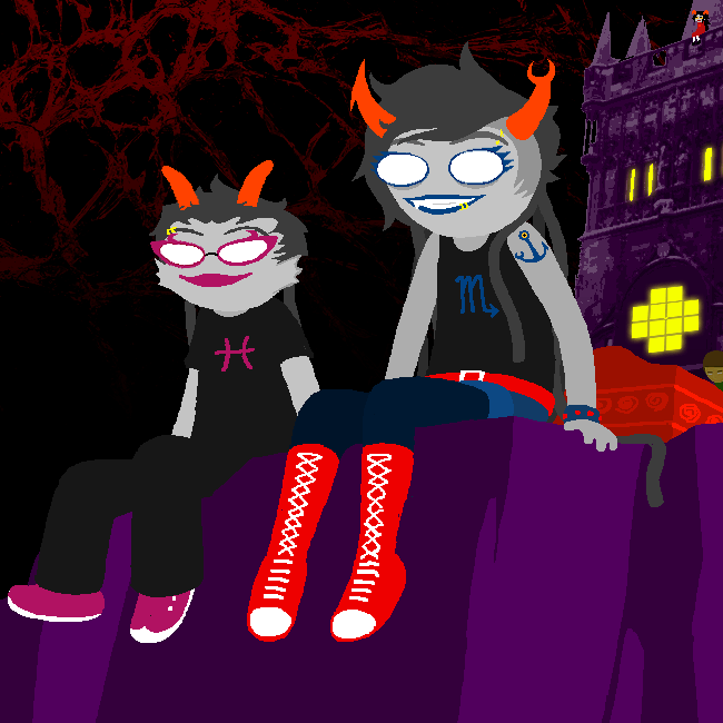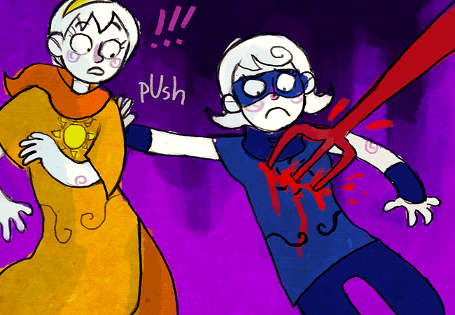 This image has a lot to unpack. Vriska has undergone a full-out pirate makeover, with a punk hairstyle, an anchor tattoo with the shapes of her horns, revamped clothing, golden jewelry in her eyes and lips, and no more glasses. Meenah, on the other hand, is the same old Meenah. Vriska’s redesign is symbolic of the completely new person she’s become, finally free from her haughty and ambitious self; it sets the stage for her encounter with alive Vriska, which I’ll probably have an absurd amount of things to say about. Don’t forget about Aradia in the top right corner, who is watching the destruction from atop the building to get the best possible view, with a smile that’s probably a thousand times as intense as Vriska’s and Meenah’s combined. Also, don’t forget about Hussie in the back, hiding behind the juju chest which never stopped being a thing or anything. Or at least I think that’s the juju chest?