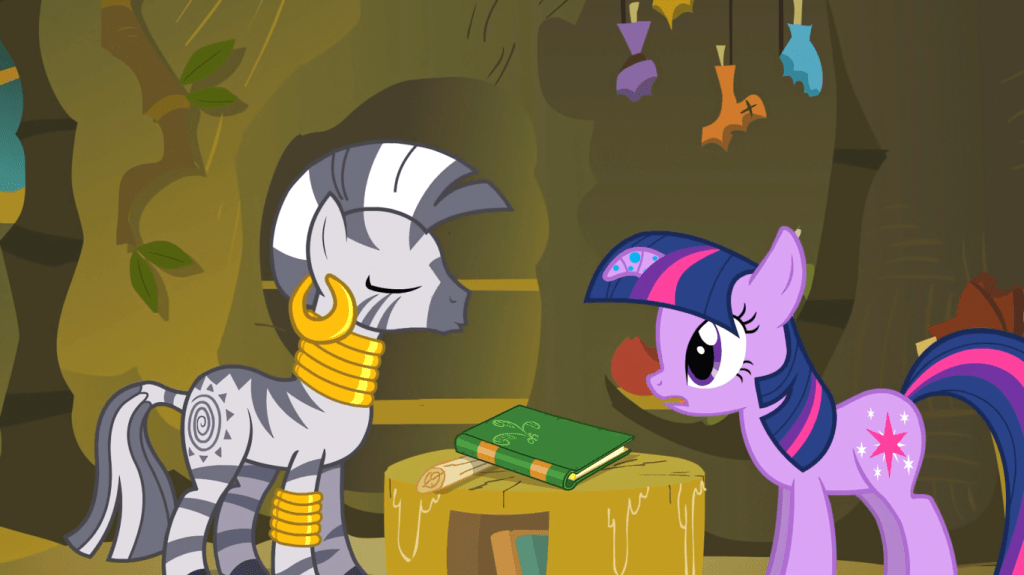 Twilight Sparkle is the only one in the room who knows what a zebra is; everyone else loudly says “a WHAT?” Zebras are apparently very obscure in the MLP universe, which makes for an interesting repurposing of a species that exists in real life—compare this to dragons or changelings or the many other species in the show that do not exist in real life. Unlike those other species, however, Zecora is the only zebra featured in the show, which gives her a cool uniqueness.