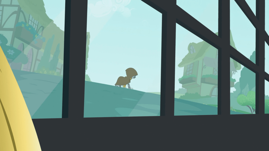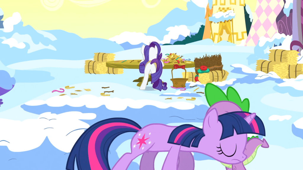 After failing to make a nice-looking nest on her first try, Twilight walks away in disappointment, because clearly there’s no such thing as starting off bad at something and gradually getting better at through practice. Again goes to show this episode is one of the more hastily put together ones.