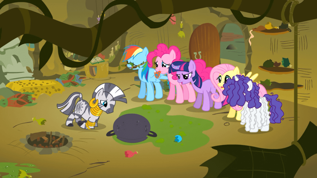 As for the comparisons to racism… Zecora’s character and residence are heavily based on African culture, making the allegories especially clear to American viewers. This episode clearly is meant to teach viewers not to be racist, but getting over stereotypes is unfortunately easier said than done, and Ponyville immediately getting over its prejudice against Zecora isn’t very believable. As cool as Zecora is, later seasons (especially seasons 8 and 9) do a better job at conveying how important it is to respect and appreciate cultures outside of your own, with many friendships between the show’s varied species and societies that we gradually get to know. Respect for other cultures is something better shown using what you should do rather than what you should not do.