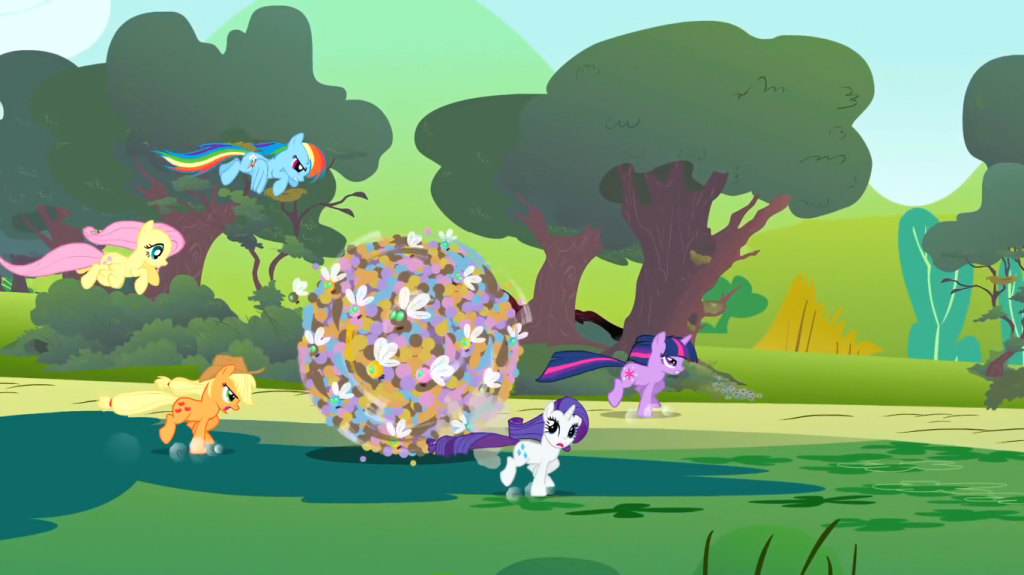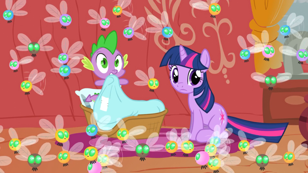 While Rainbow Dash is endlessly hassled by these bugs, Rarity has found a good use for them… at least until she is exposed to their method of reproduction, which involves coughing up a sticky substance that turns into another parasprite. I find it funny that she’s grossed out by simple animal biology; clearly she doesn’t understand how animals work, or that all creatures have their own different methods of reproduction.