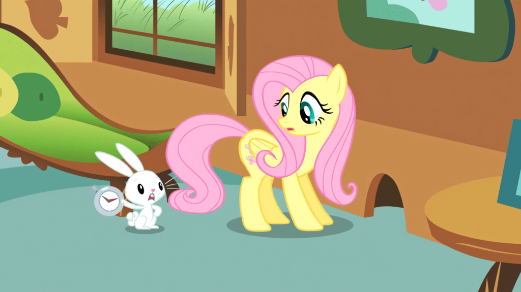 This episode starts with Fluttershy at home tending to her animals, until Angel reminds her of an imminently upcoming brunch party at Sugarcube Corner, where Celestia has come to visit. After Fluttershy leaves in a hurry, Angel locks himself inside the house, finally ready for some peace and quiet. Angel is one mischievous bunny—his name is far more indicative of Fluttershy’s personality than his own. Not because Fluttershy is an angel (even though she is), rather because she thinks of every single animal she knows as an angel.