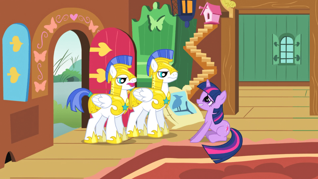 Twilight Sparkle’s plan is intercepted by a pair of royal guards, who come in to inquire about the royal pet. Philomena starts coughing from within the basket she’s in, so Twilight starts coughing herself to mislead the guards and gets Fluttershy to join in. The guards don’t seem convinced, so Twilight slams the door on them before they can say anything more. Her neurotic attempts not to disappoint Celestia never fail to be hilarious.