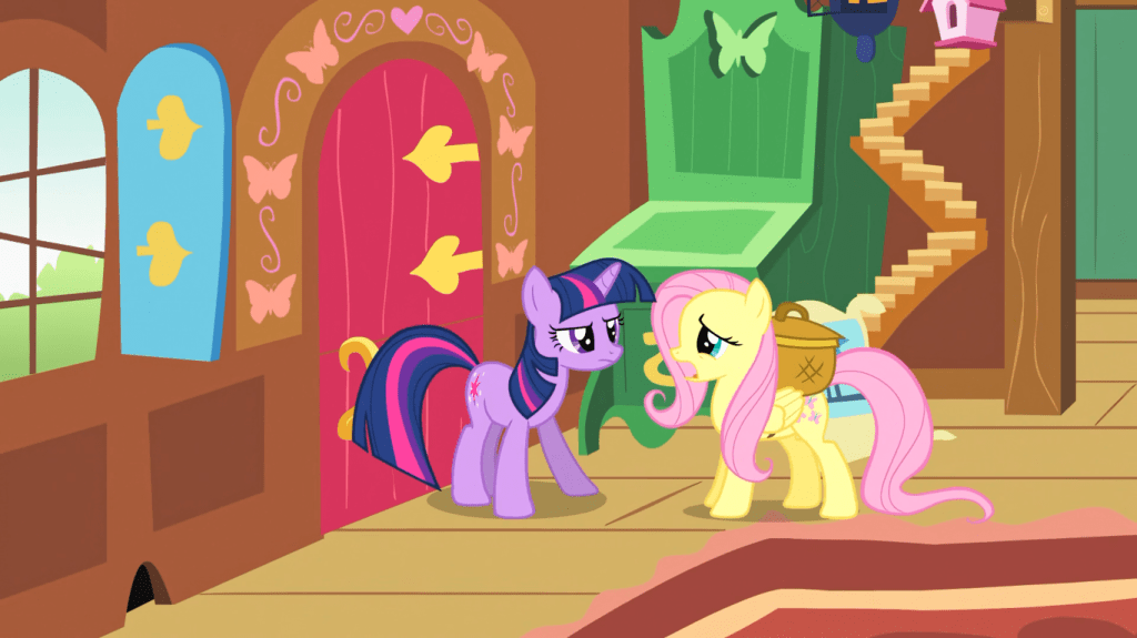 Twilight Sparkle and Fluttershy argue about whose fault this whole situation is; Twilight thinks Celestia will go easier on her than on Fluttershy, but Fluttershy knows it’s her fault and owns up to it.