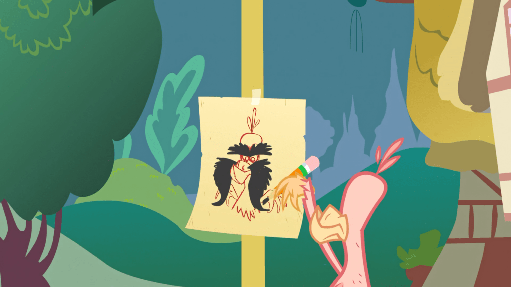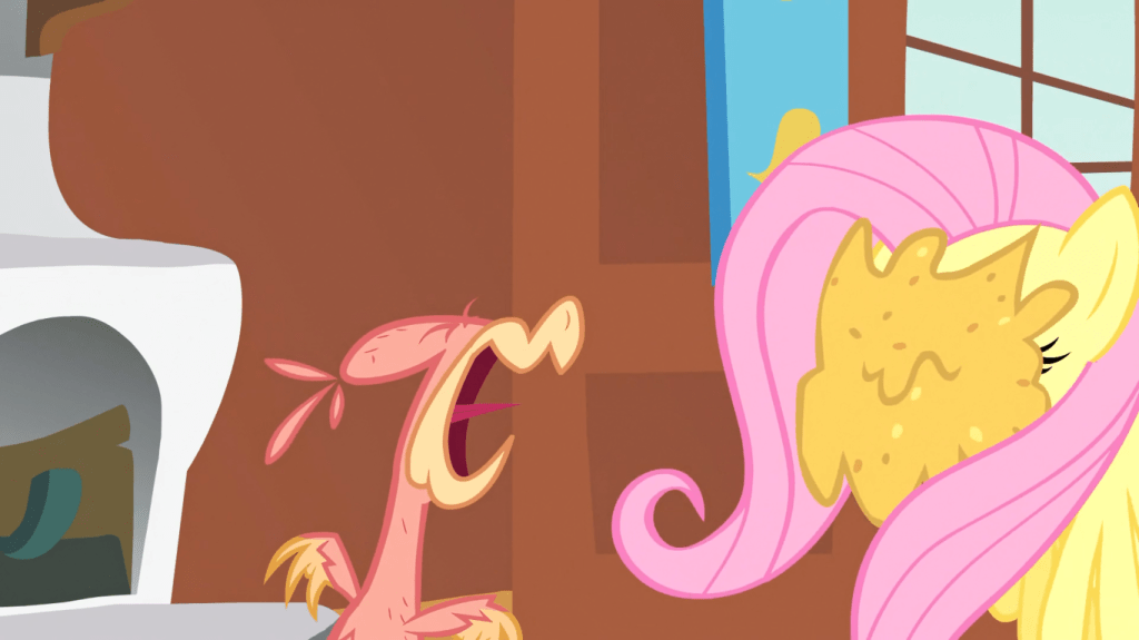 Fluttershy and a friendly bird who was previously sick named Humingway take turns singing the show’s theme song. She the tries the same with Philomena, but the bird vomits in her face. Earlier in this episode, Philomena chowed down a whole bunch of bird food while avoiding the pill surrounding it; clearly she intended to save the bird food for this very moment, to play a rather mean prank on Fluttershy.