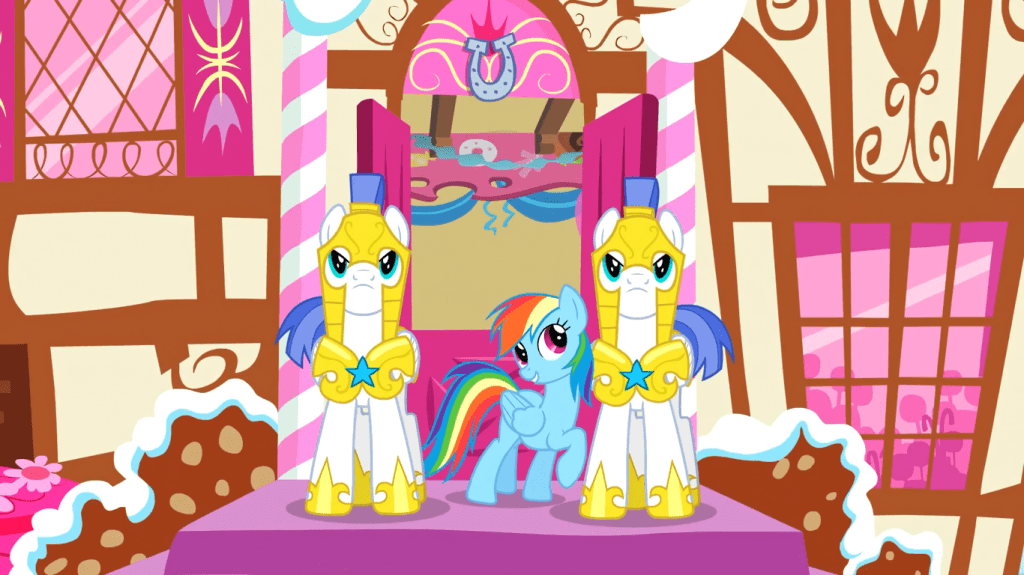 Rainbow Dash makes a few funny faces at the guards and then gets bored, showing she’s not one to dilly-dally too much. The royal guards then refuse to let Fluttershy in until Twilight sees her and confirms she’s on the waiting list, indicating the tight levels of royal security that Equestria has in place.