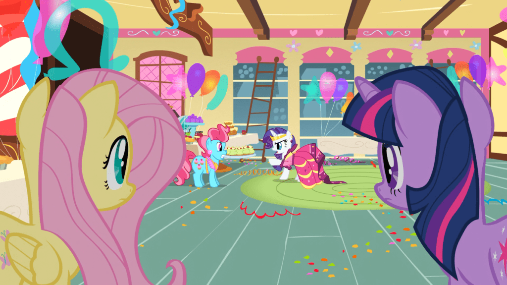 At the party’s outskirts, Rainbow Dash speculates to a pair of silent royal guards about what it’s like to be a royal guard and what it takes to get in. I guess at this point, Rainbow Dash views getting into the Wonderbolts as a faraway daydream and is taking a moment to aspire for something more realistic? This scene clearly hints at some self-doubt in Rainbow Dash’s character arc, which leads to a massive swath of nuances most people don’t appreciate… or maybe it’s just early installment weirdness. It would be a weird case thereof, because we’ve already had multiple episodes featuring Rainbow Dash’s Wonderbolt fantasies.