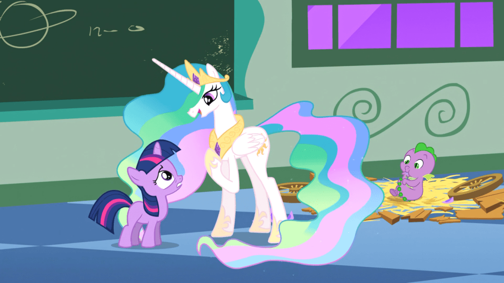 Twilight Sparkle has to take an entrance exam to get into Celestia’s school, which involves using magic to hatch a dragon’s egg. She fails at first, but then a shocking rainbow wave incites her to do the magic spell successfully to hatch newborn Spike, then the spell goes out of control. Celestia fixes the spell and accepts Twilight Sparkle not just as her student, but as her personal protege. I highly doubt every entrance exam for Celestia’s school involves hatching a dragon egg; it’s not the kindest thing in the world to snatch a whole bunch of eggs from dragons to use for ponies’ magic trials. It’s clear in light of later episodes that Celestia set up this predestined event, which includes getting Spike’s egg from mysterious sources so that Twilight can have a loyal dragon assistant to send Celestia letters whenever she pleases.