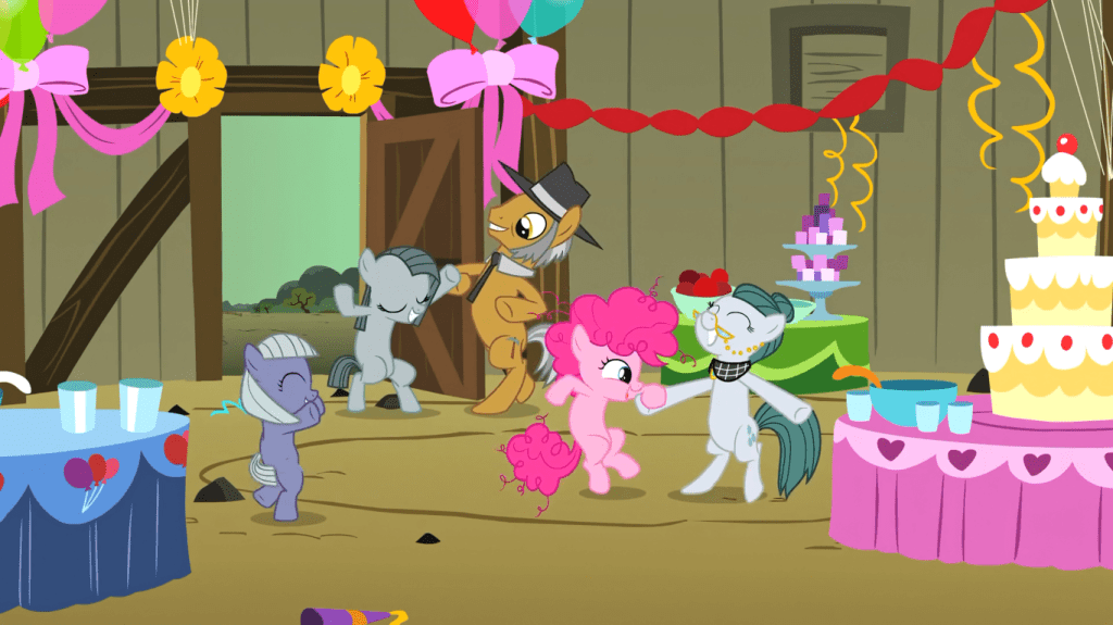 Pinkie Pie’s last statement calls her entire story into question for new viewers, but later seasons make it clear that yes, she really did grow up on a rock farm and has a family of extremely traditionalist rock farmers who know everything there is to know about rocks. It’s really cool to see her family fleshed out without compromising their dedication to rock farming, especially considering that Maud Pie (who doesn’t appear in this episode) later becomes a recurring character.