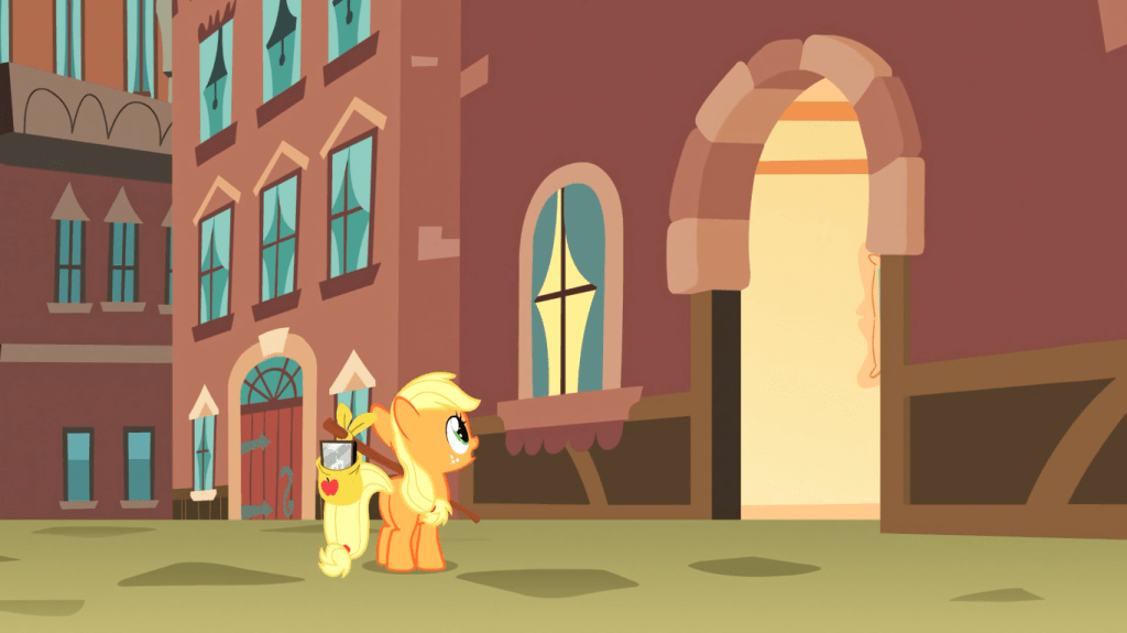 Although Scootaloo is set on finding Rainbow Dash to learn her cutie mark story, the Crusaders run into all the other Mane 6 ponies before her, and each of them tell how they got their cutie marks. First off is Applejack, who tells a story of how she didn’t want to live on a farm all her life and set out to live with her Aunt and Uncle Orange in Manehattan. While most of the Mane 6 ponies tend to be their same usual selves in flashbacks, Applejack in flashbacks contrasts against the honest and hard-working farm pony we know today. This contrast shows that people typically aren’t born with the traits they’re known for but rather learn them from experience.