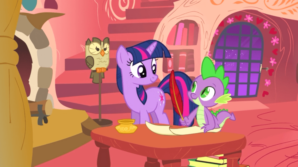 Owlowiscious beats Spike to the punch of retrieving books for Twilight Sparkle. Twilight’s quill then breaks, and Spike goes through a whole bunch of trouble to get a new quill. He digs through the house to no avail, goes to a store selling quills and sofas only for it to be all out of quills, asks Pinkie Pie for a quill only for her to provide him a bunch of other things that start with Q, and then wrestles with a chicken until he finally gets a tiny white feather. But then it turns out Owlowiscious has let Twilight use one of his feathers as a quill. I know exactly how irritating it feels to go through a bunch of trouble to do someone a favor, only for someone else to have completed the task much more quickly—it feels like that person is simply more competent than you. This naturally strengthens Spike’s rivalrous perception of the owl, especially after the owl discovers that Spike burnt the astronomy book and Twilight chews him out for it.